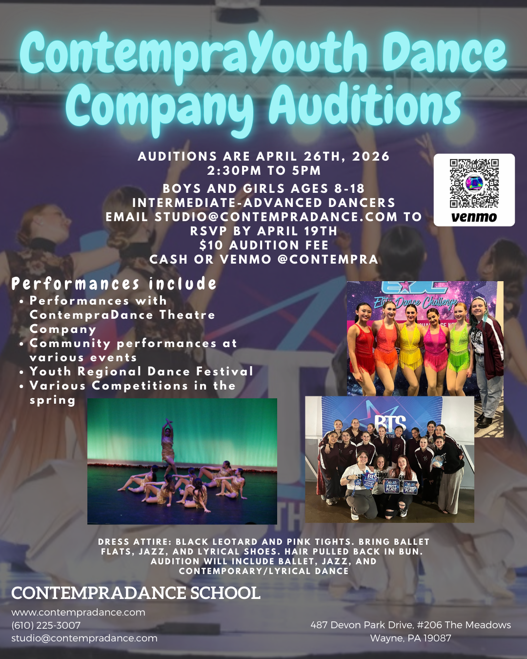 ContempraYouth Dance Company auditions will be May 2026 at the studio. Date to be determined soon. Ages 10-18 girls and boys. Audition fee: $10.